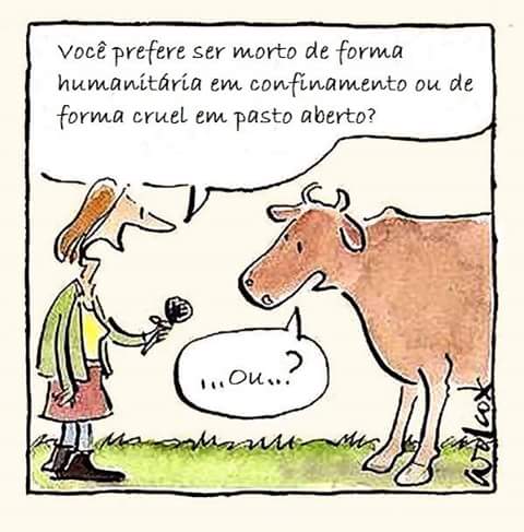 Vamos aos fatos. Em matadouros não considerados humanitários, os animais são mortos com golpes de marretas ou com tiros de espingardas em ambientes geralmente insalubres. E nos considerados humanitários, de acordo com o Sérgio Greif, por exemplo, há um conjunto de procedimentos que garantem o bem-estar dos animais que serão abatidos, desde o embarque na propriedade rural até a operação de sangria no matadouro-frigorífico. Mas veja bem, e ele acerta em cheio nesse ponto: termos como “humanitário” e “bem-estar” deveriam ser aplicados apenas nos casos em que buscamos o bem do indivíduo, e não para as situações em que ao final vamos matá-lo de alguma forma". O ato de matar o animal em questão já neutraliza e nega qualquer possível ato humanitário dirigido a ele.